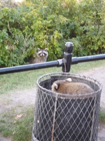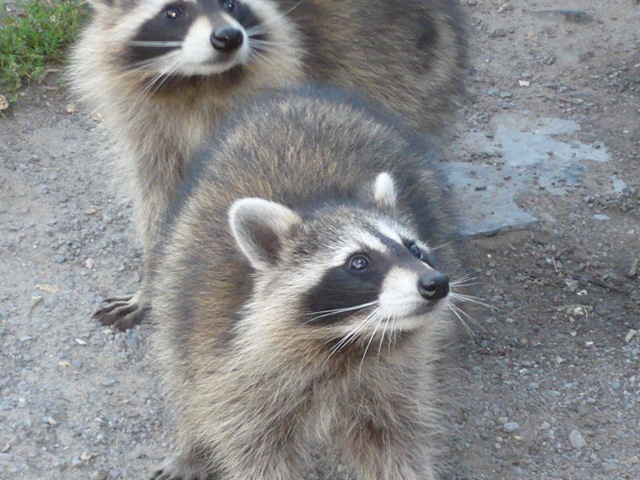 Aquí millones de avispas revolotean a nuestro alrededor. Nos comemos un helado disfrutando de la vista, y de vuelta al centro. De camino, paramos en otro mirador y ¡¡SORPRESA!! 6 o más mapaches campando a sus anchas nos esperan. La gente les echa de comer y los tenemos bien, bien cerquita. Qué bonitos. Queremos uno para llevárnoslo y que juegue con Mora. Que pena que no los podamos sacar del país, pues seguro que hacían buenas migas (o más bien el mapache hacía migas a la pobre Mori). Que uñacas tienen los jodíos…