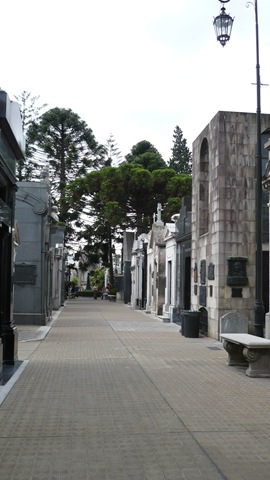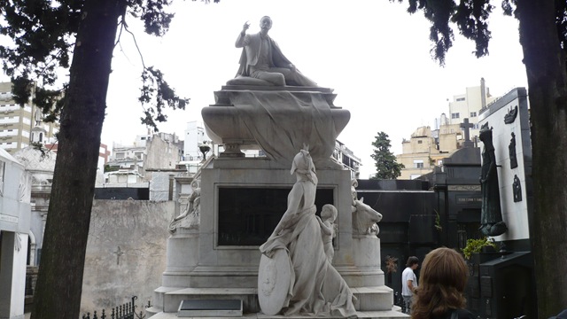 Cogemos un taxi a otra zona, La Recoleta. Vamos a la Plaza Alvear, llena de puestecillos de artesanía. Entramos al famoso Cementerio de la Recoleta, y justo hay una visita guiada gratuita, así que allá que vamos. Y menudo acierto, porque es un lugar precioso (a pesar de ser un cementerio), donde hay unas tumbas espectaculares, auténticas obras de arte de mármol o granito, esculpidas, etc… En realidad no son tumbas, son todo panteones familiares y bóvedas, muchas con vidrieras increíbles… Nos cuenta la guía varias historias como la de Rufina, una chica enterrada cataléptica, vemos la tumba de Eva Perón cuyo cadáver estuvo viajando por el mundo durante años, y otras muchas historias más. Una visita imperdible.