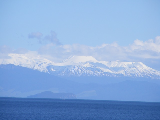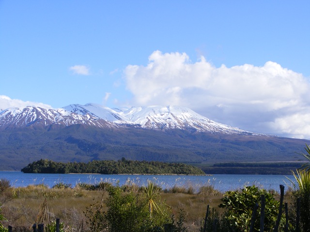 Tras infructuosos intentos de encontrar el restaurante recomendado en la Lonely Planet (ya que la guía decía que era un local que pasaba desapercibido, pero vamos, que sólo había casas donde nos enviaba) Comemos en la ciudad de Taupo en un restaurante con vistas increíbles al lago y al volcán Tongariro, nuestro próximo destino. Y hacia allí que vamos, y María hace alarde de su pericia al volante y conduce durante casi 2 horas de manera impecable. para que luego digan…..