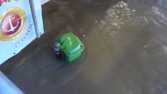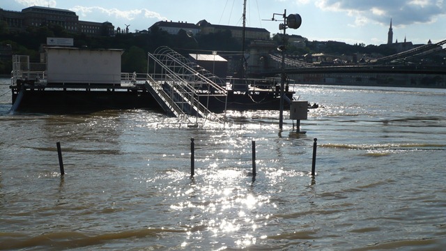 Finalmente, nos vamos a cenar al Danubio. Alfonso nos ha reservado para cenar en un restaurante chic en un barco en la orilla del río. Estupefactos, vemos la crecida del río por la cantidad de lluvias que ha habido en la región estas últimas semanas: