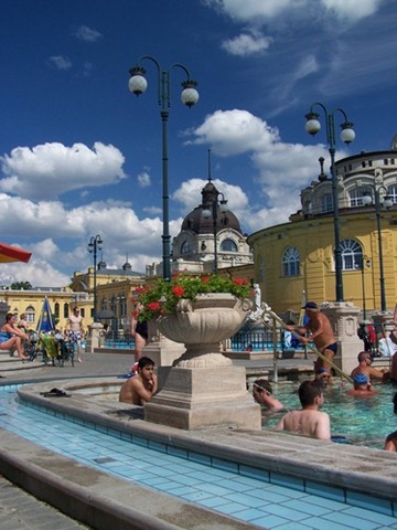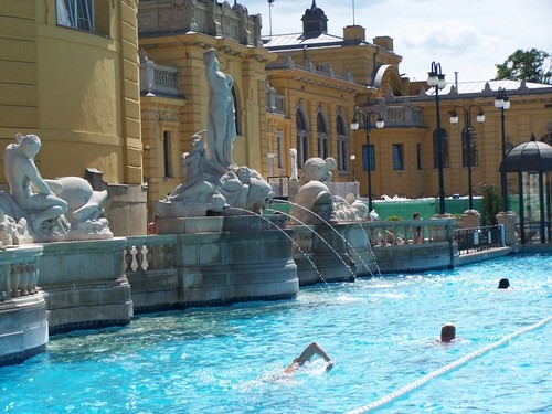 El tren sale a la 1 y 50 camino de Budapest… Y como a la ida, sin noticias llegamos a la estación de tren. Vamos a refrescarnos a casa de Alfonso, y tras poner una lavadora nos vamos a las termas de Széchenyi, unas aguas termales descubiertas en 1789. No nos hemos llevado la cámara, pero me permito enlazar unas fotos desde Panoramio: