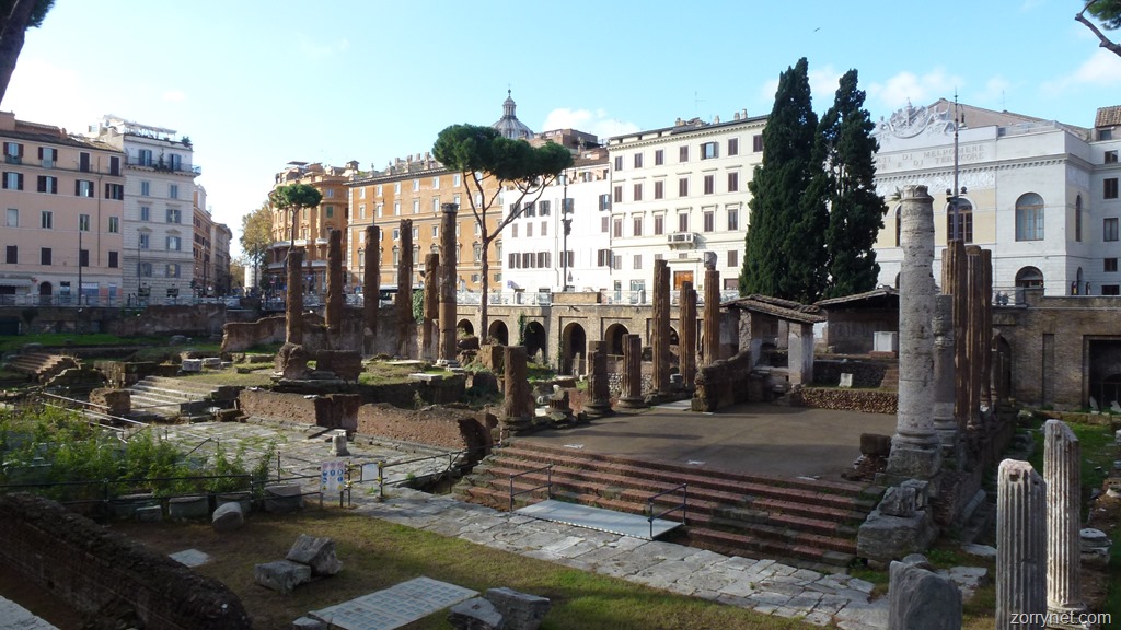 En fin, salimos del Corona y partimos dirección suroeste por la Via Nazionale hasta llegar a la Piazza Venezia. Continuamos por el Corso Vittorio Emmanuelle II hasta llegar a las ruinas del Área Sacra di Largo Argentino, lugar reconvertido en un santuario felino. De hecho, de una mirada podemos contar decenas de mininos.