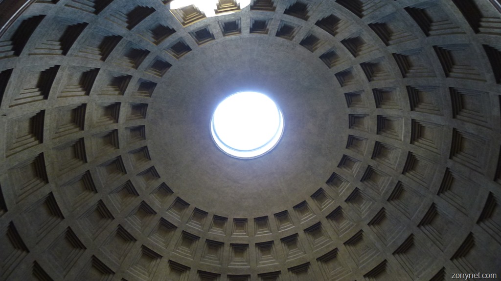 Como curiosidad, el centro de la cúpula está abierto al aire libre, y cuando llueve, el agua se cuela por agujeros practicados en el suelo de mármol.