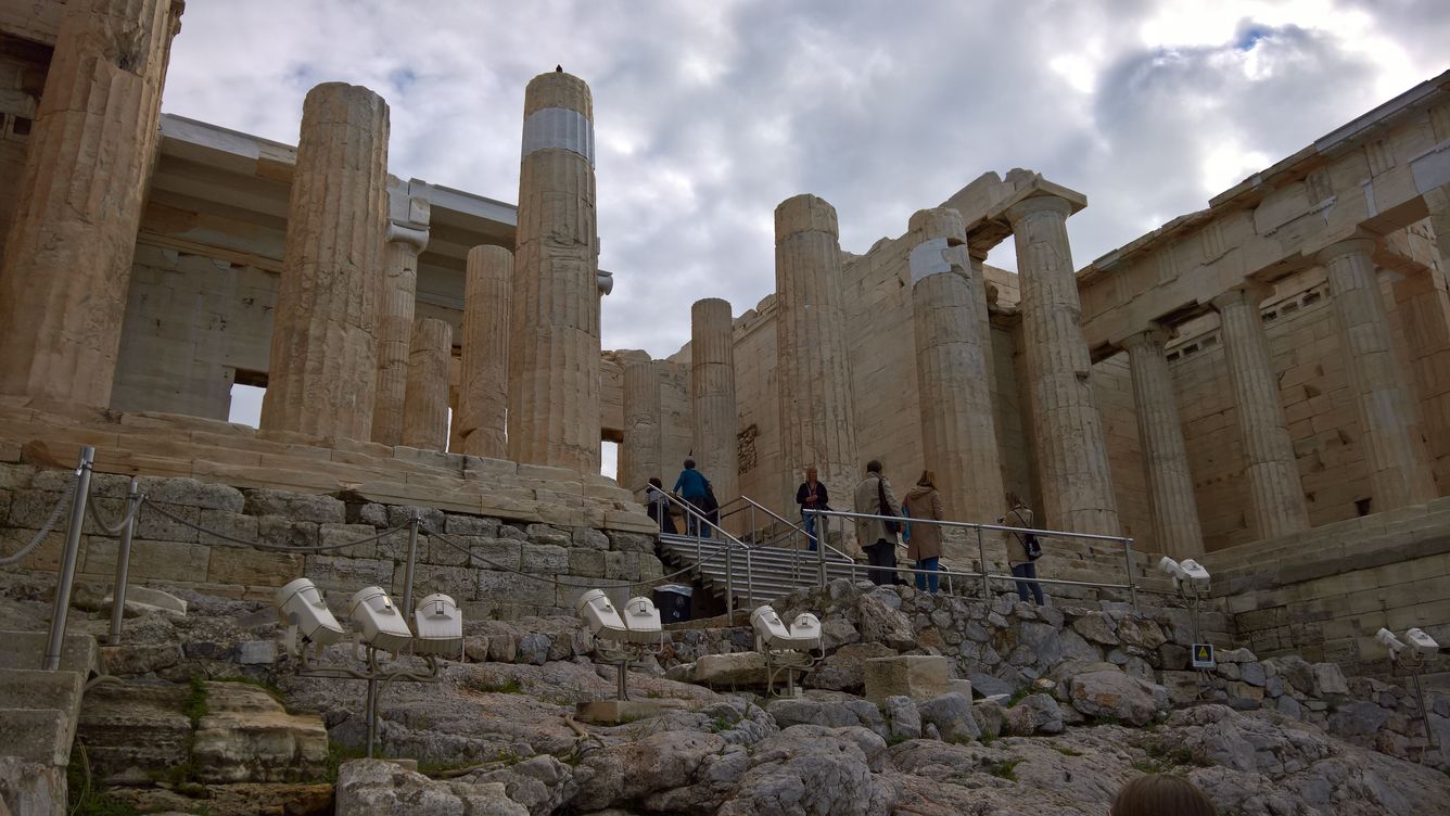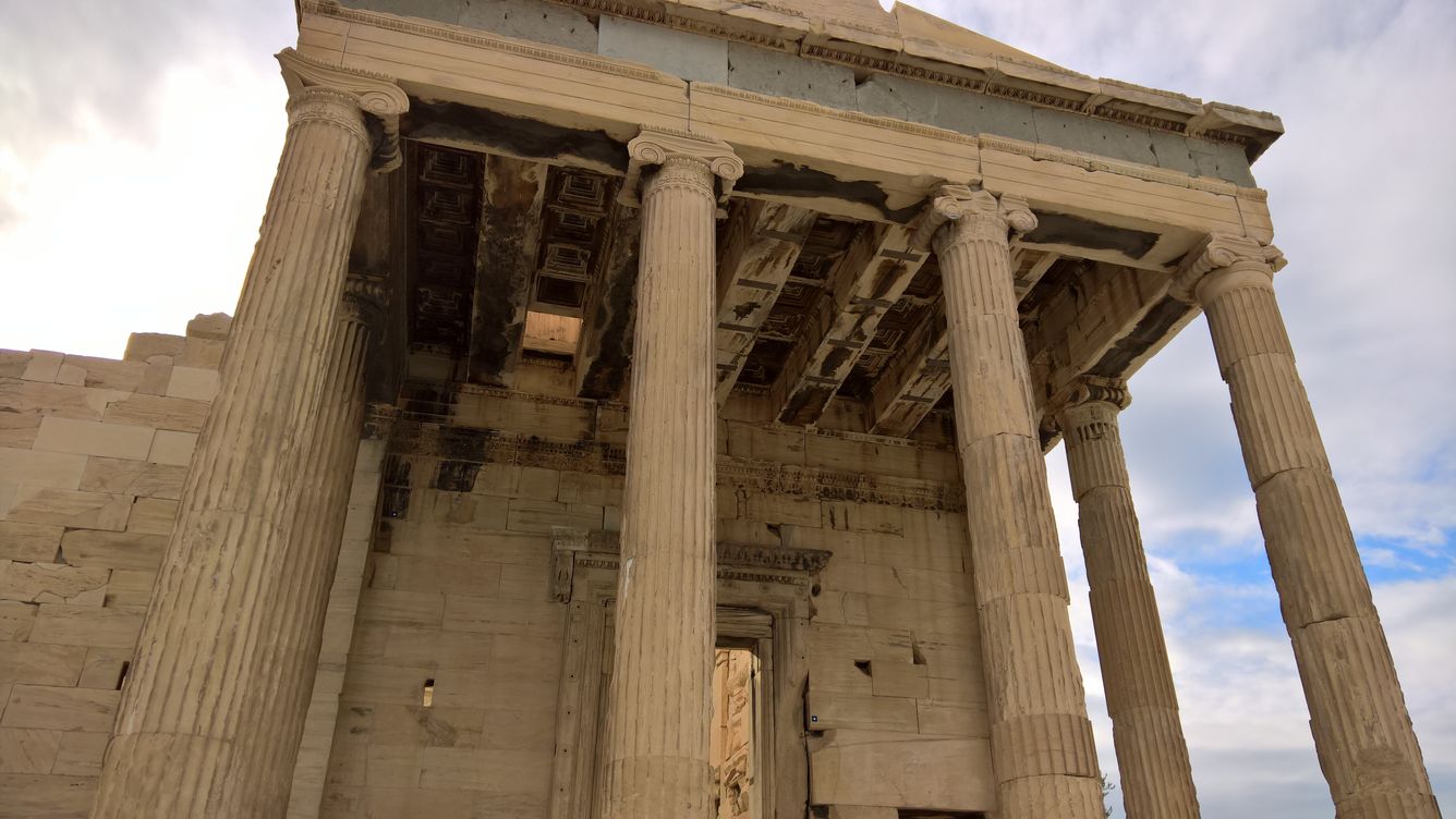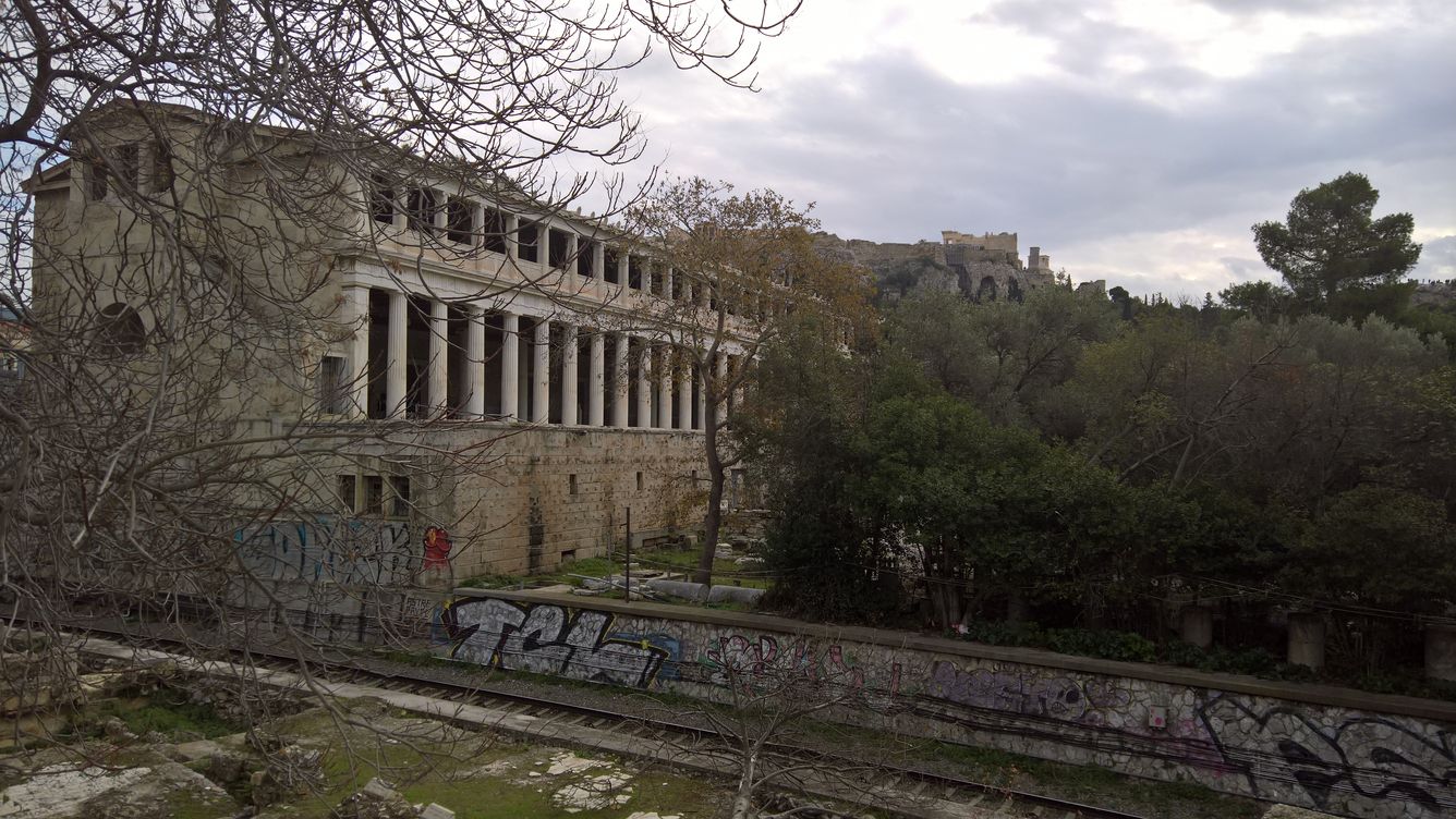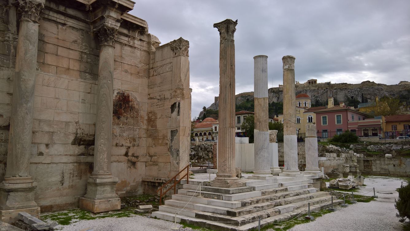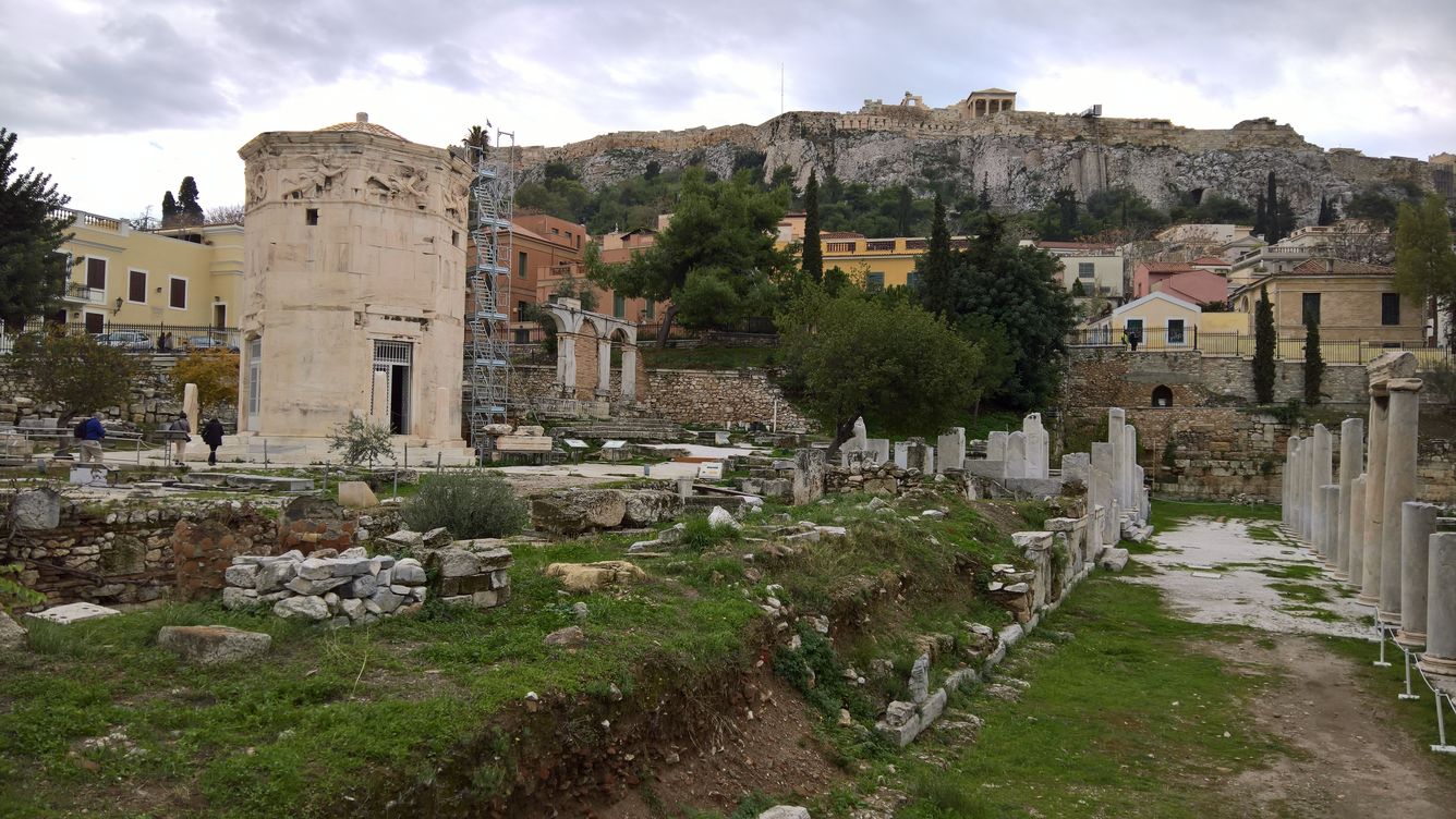 Tras disfrutar de las vistas un rato y hacer unas fotos, salimos en dirección al Ágora antigua. Aunque nos cuesta un poco orientarnos, salimos en dirección contraria con lo que nos toca rodear toda la acrópolis, aunque tampoco nos importa ya que de paso conocemos un poco los alrededores. Finalmente llegamos, tras pasar por la plaza Monastiriki, a la biblioteca de Adriano, lugar creado para almacenar la gran colección de «libros», papiros en realidad, propiedad del emperador. Fue un edificio impresionante, aunque en la actualidad apenas quedan unas pocas ruinas, aun así impresionantes.