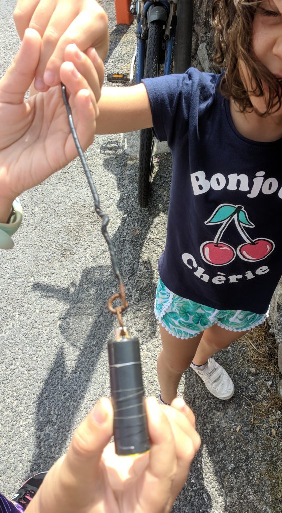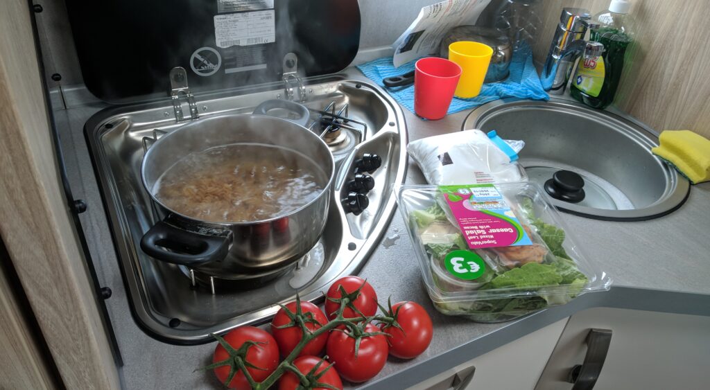Llegamos y tras rellenar tanques y aparcar, hacemos la comida, preparamos una ensalada de pasta muy rica, y después de comer, María se acuesta un rato para descansar y las niñas y yo vamos a buscar un geocache cercano. Lo encontramos enseguida y volvemos a la caravana dando un paseo por la playa.
