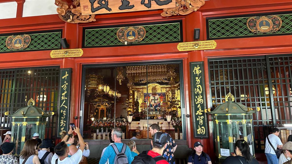 Paramos en el 7 eleven de al lado del hotel y cogemos unos bollitos que nos comemos encantados. Y a continuación enfilamos hacia el barrio de Asakusa, donde se encuentra el templo de Senso-ji. Damos una vuelta disfrutando de las vistas (y de la gente, imagino que al ser domingo mucha gente aprovecha para venir a rezar). El calor empieza a apretar pero de momento no necesitamos tirar de ventilador portátil, buena señal.