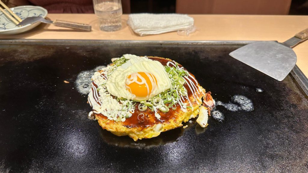 Tras dos horas y media de siesta, rato en el que he estado mirando información y me bajé al 7 eleven a por algo de merienda y una cerveza, Blanca se levanta muchísimo mejor, menos mal. Decidimos ir a buscar algunos souvenirs pero no damos con la tecla del sitio. Sin embargo encontramos un sitio donde comer un Okonomiyaki que es una torta de patata / maíz con cosas encima (parecido a una pizza) en nuestro caso la pedimos con cerdo, pulpo, verduras huevo y una salsa parecida a barbacoa. Lo curioso es que la preparan en una plancha a la vista de los comensales y luego la pasan a la plancha que hay en tu mesa. Delicioso!