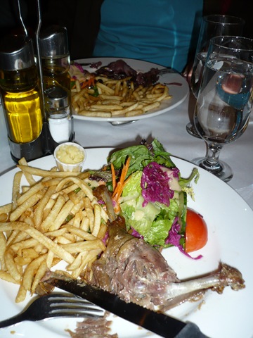 Enseguida nos encaminamos a cenar, a un sitio recomendado por la guía, Freres de la Côte, y ¡que buen sitio! Al más puro estilo francés, las mesas super juntas, acogedor, bullicioso… Así que en cuanto nos traen los platos, se nos olvida el bullicio de la gente. Maris se ha pedido un confit de pato, y yo un steak de caballo (si si, de esos que pasean a la gente por aquí tirando de los carruajes). Bueno no se realmente a lo que se dedicó mi caballo, pero he de decir que estaba realmente rico.