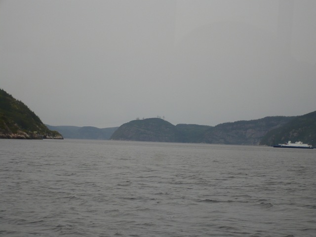 Llegamos sobre las 12 y pico al primer sitio donde vendía excursiones ¡¡¡BINGO!!! A la 1 sale un crucero de 3 horas, así que compramos los tickes, vamos al baño y nos disponemos a embarcar. Por cierto, embarcamos en Tadoussac (Todusó 😉 ) a orillas del fiordo de Sagüenay, el fiordo más septentrional del hemisferio norte. Nos forramos de capas y más capas (todo lo de abrigo que hemos traído al viaje), parecemos el muñeco de Michelín jajaja. Cuando estamos esperando para subir al barco llega un autobús… ¡Anda! ¡Españoles! Que viva la Pepa, ya sé por qué no los echaba de menos, ¡¡¡que escandalerío!!!