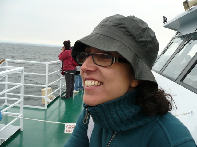 En fin, que nos sentamos en la planta baja del barco, y entre que no se ve nada y se nos sientan nuestros compatriotas a darnos la murga… No tardamos ni cinco minutos en salir a cubierta… Estamos impacientes por ver a las ballenitas!!! Por megafonía nos dan instrucciones para identificarlas, así que empezamos a escudriñar el horizonte a ver por donde resoplan. Eso si, con un frío de pelotas, no es por ser soez, es que corre un aire frío que corta el cutis… 😀
