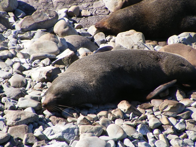 Durante el camino, encontramos un cartel que pone Ohau Point Seal Colony y paramos a ver las vistas… Y las focas salvajes que están echándose la siesta de después del desayuno o de antes de comer… No se bien, el caso es que están todas bien tranquilotas repanchingadas al sol, asi que tuve que echarles unas buenas fotos…
