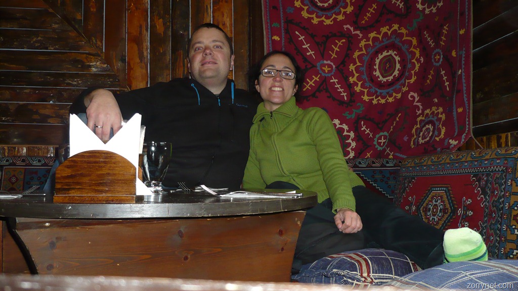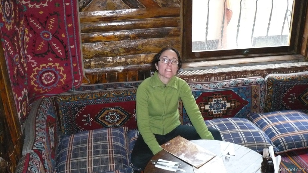Una vez arriba, tratamos de pasear por la plaza, pero hace tanto frío que nos cobijamos en la calle comercial Istiklal. Algo así como la calle Preciados pero como 10 veces más largas. Cuando llegamos a esta calle recordamos que nuestro amigo Javi nos recomendó un restaurante llamado Gani Gani. Lo buscamos y subimos a la segunda planta, lugar donde podemos comer sentados en el suelo entre cojines. La comida además, de lo mejorcito que hemos probado hasta ahora y además bastante barato…