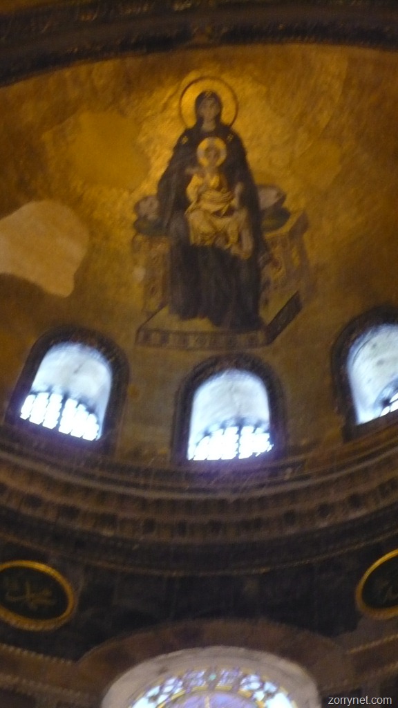 Estas son algunas de las vistas del interior de Santa Sofía. En su parte superior existe un museo donde se aún se conservan algunos frescos de la época bizantina de la catedral, en la foto aparece en el centro la Virgen María con Jesus, y a su lado uno de los emperadores. En la segunda, el Arcangel San Gabriel, en la bóveda de la fachada principal.
