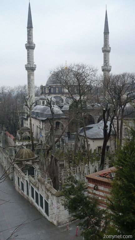A cambio, damos un paseo por el cementerio de Eyup, lugar donde podemos comprobar como comparten sitio lápidas otomanas, bizantinas y turcas. Sinceramente es un paseo bastante agradable aún con el ruido de los cuervos sobre nuestras cabezas, subiendo la ladera a pie hasta llegar al famoso café Pierre Loti, situado en la estación superior del teleférico. Desde allí hay unas increíbles vistas de la ciudad, pero con el tiempo se quedan en modestas vistas de la mezquita y el cementerio.