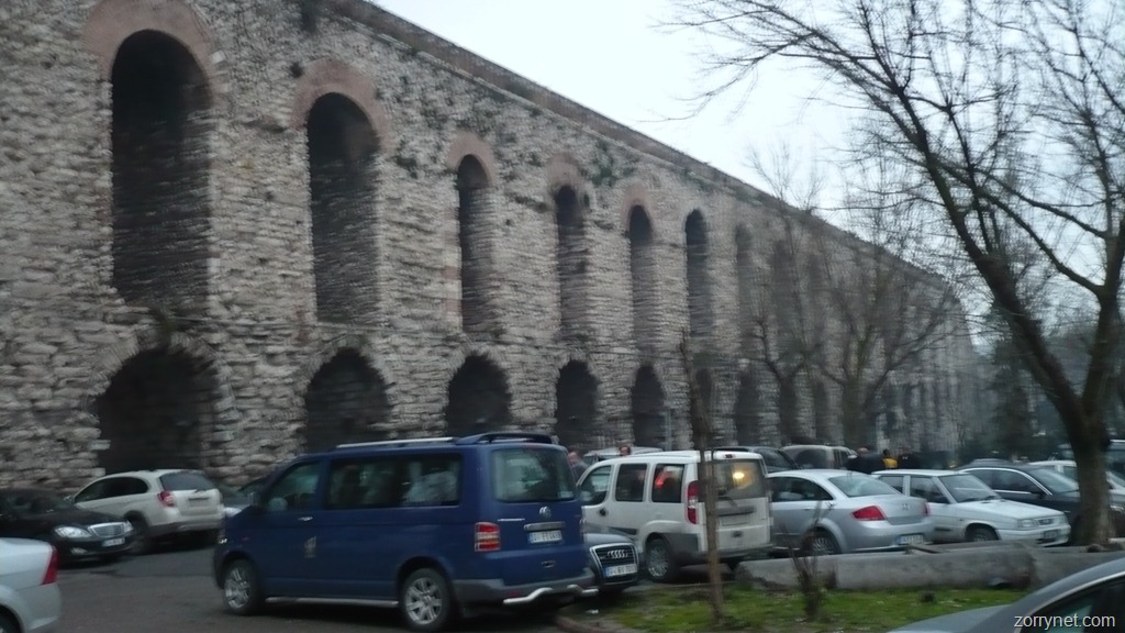 Tomamos otro autobús que abandonamos en el barrio de Fatih. Ahí podemos ver durante un momento la mezquita de Fatih, y continuamos ya a pie por la calle Macar Kardesler. Y encontramos uno de los acueductos que surtían de agua en su momento la Cisterna de la Basílica.
