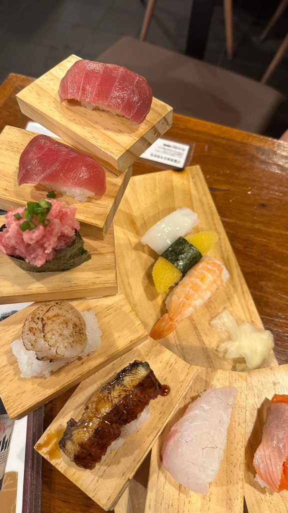 Sobre las 6 nos vamos a despedirnos de la ciudad, esta vez vamos a ver tiendas al Shinshaibashi-suji otra calle comercial atestada de gente, tiendas (esta vez tiendas rollo Zara, Adidas, multinacionales vaya) y también muchos sitios de dulces y demás. Al final nos comemos una especie de gofre dulce relleno de queso que estaba bien (tampoco para tirar cohetes) y un helado de chocolate con churro de chocolate que estaba tremendo. Ya salimos de la zona y buscamos un sitio para cenar sushi de despedida. Cenamos muy bien unos sushis de atún salmón y un variado riquísimo, y Olivia una carne wagyu a la brasa que al parecer estaba muy buena porque no la pude catar jajaja