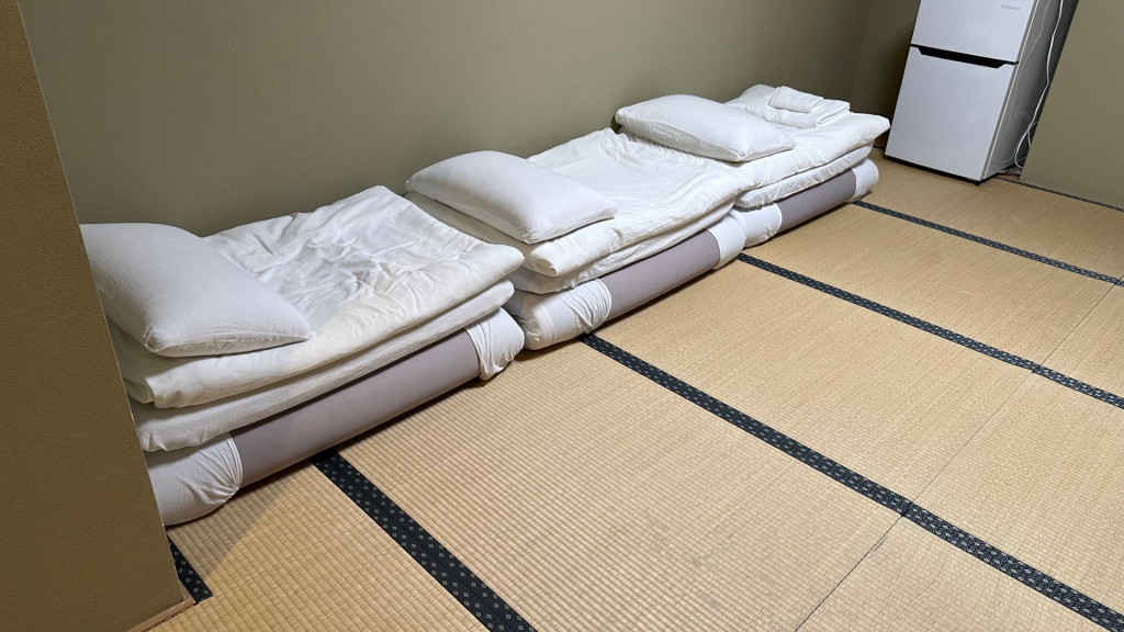 We get off the train at Ueno Station and walk for about ten minutes, guided by Google Maps, towards Akihabara, where our hotel is located. We’re staying at the Akihabara Nakagawa Inn, a charming and comfortable three-star hotel just five minutes from the heart of Akihabara. The room has tatami flooring and futons for sleeping, which looks quite cozy and offers an authentic Japanese experience. The only downside? No windows!