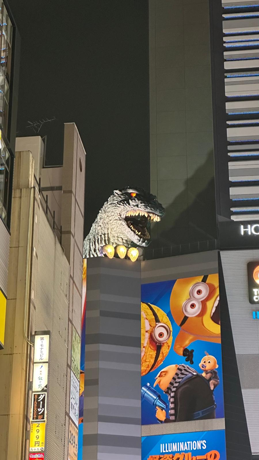 After dinner, we keep strolling for a bit and finally spot Godzilla’s head from the street. Unfortunately, we couldn’t get up close to see it properly… I have no idea how we missed it yesterday since we walked right past here.
