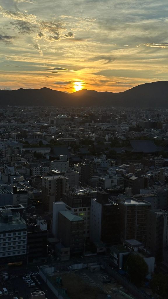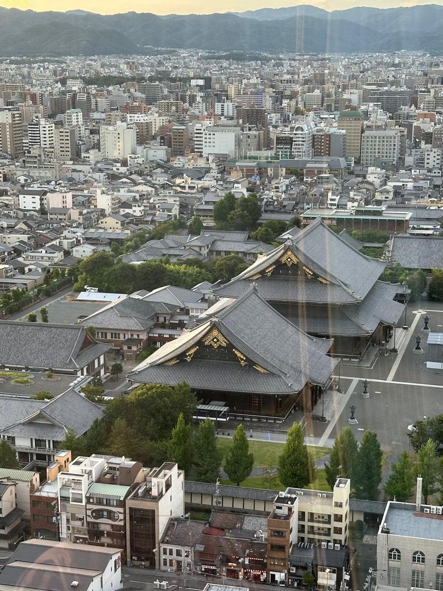 Between this, the walk to the hotel, and checking in, it’s already 5 PM, and most temples are closed. So, we head to Kyoto Tower, pay the 900 yen fee, and go up (okay, it’s only about 100m high, not as tall as Tokyo Tower, but the views are cool). We spend some time enjoying the scenery and the sunset, then head down and realize it’s finally not unbearably hot anymore…