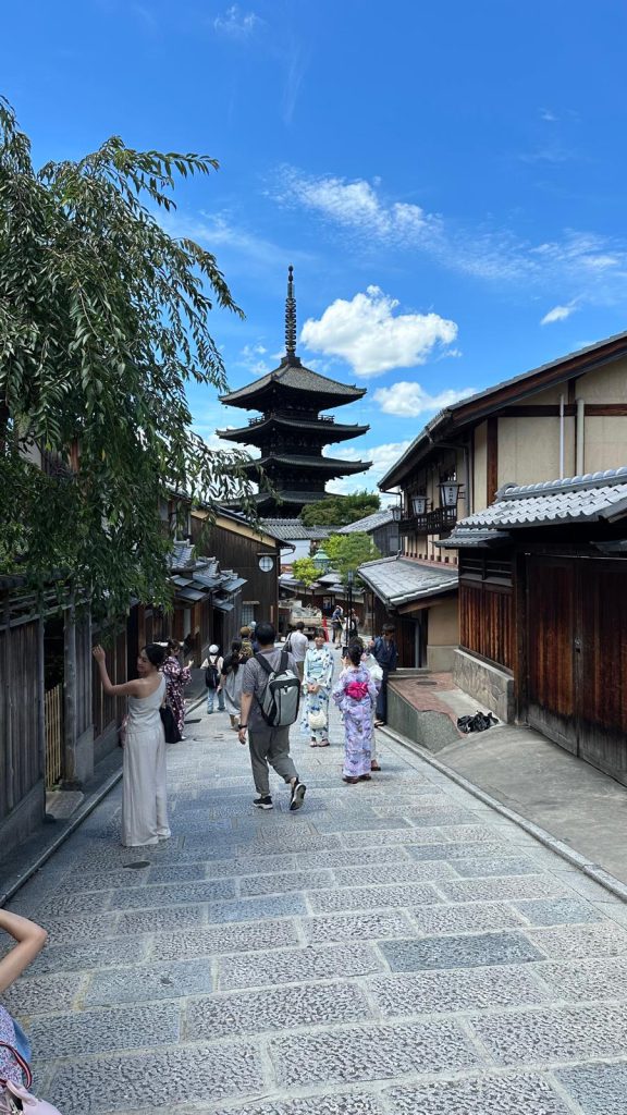 Afterward, we headed to Kiyomizu Temple, which is quite nearby—though we struggled a bit to find it, as we were a little disoriented with the map. The whole district is breathtaking, and while the main street leading to the temple is beautiful, it’s packed with souvenir shops. Naturally, we couldn’t resist buying a few things. And given the scorching heat, the occasional shop stop was a nice way to cool off.