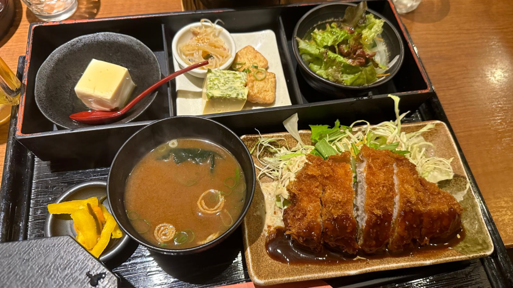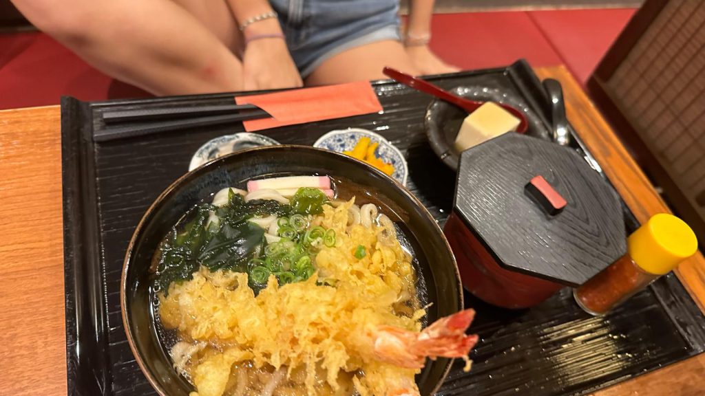 By the time we finished the visit, we were absolutely roasted, so we stopped for some amazing ice cream—vanilla for me and milk-flavored for Olivia. It was exactly what we needed to cool down. And as for walking back? No way. We took a bus. Then, another train back to Nara Station, and by the time we arrived, we were starving. We found an amazing little restaurant where you sit on tatami mats, barefoot. What a feast we had! Everything was absolutely delicious!