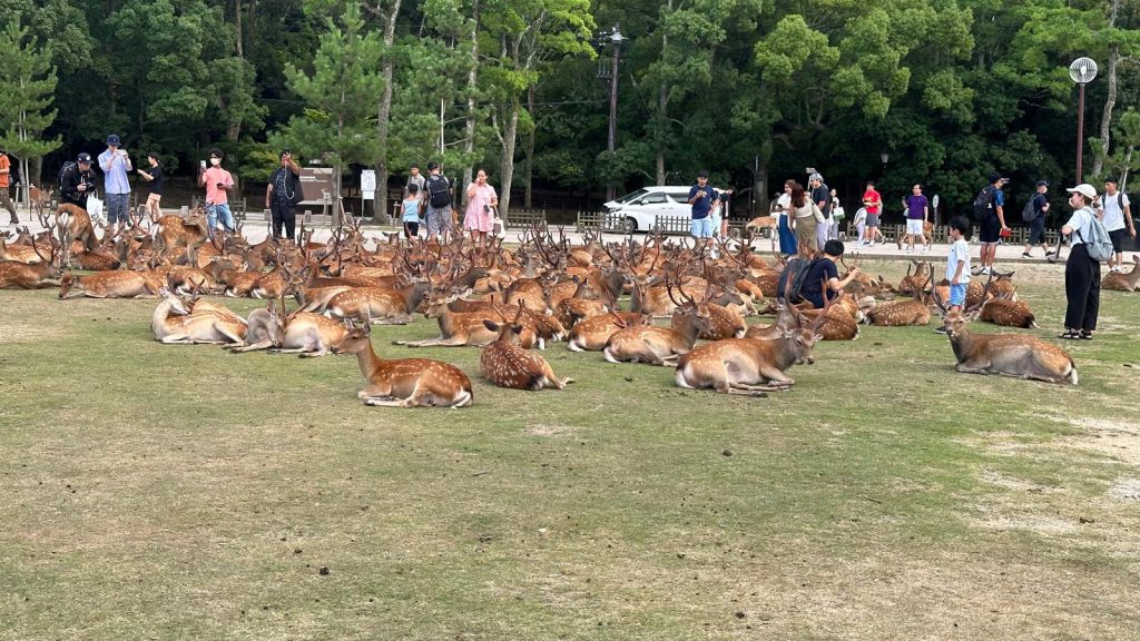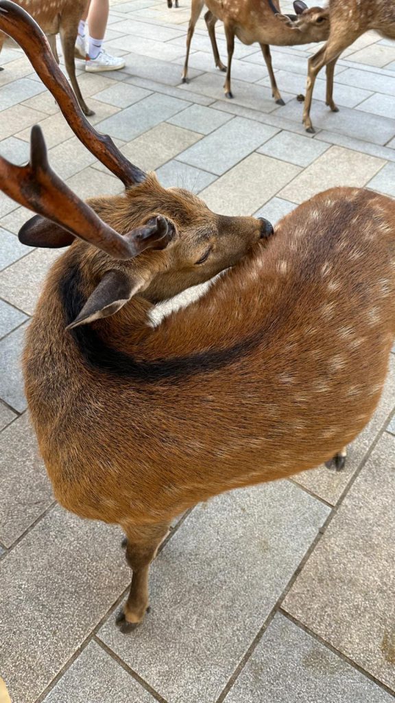 After that, we headed back to the hotel to rest a bit and wait for the heat to subside. Around 5 PM, we went out again to Nara Park, where we got to hang out with tons of deer! Even though they’re wild animals, they’re so used to people that they let you pet and even feed them. But be careful—if they figure out you’ve got food, they can get a bit aggressive. Blanca and I even got a little nibble (no harm done, though).